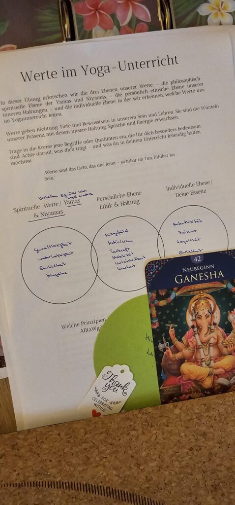 physischer und mentaler Unterricht: Hausaufgaben zu jedem Wochenende, Gruppenarbeiten im und neben dem Unterricht, Online lernen und üben (Online Videos und mp3´s zu Übungssequenzen, Pranayama, Meditation, Ausrichtung, Vorlesungen, Scripts, Powerpointpräsentationen, Anleitungen, Stundenkonzepten, etc. Einführung in Yoga-Philosophie, Geschichte und Hauptschriften. Hatha Yoga bspw. Entspannungstechniken, Stressbewältigung, Prävention. Asanas bspw. Yoga-Stellungen, Chakras, Mudras und Mantras. Pranayama – Atemschulung und Atemtechniken. Anatomie und Gesundheit inkl. Ernährungslehre ( Präsenz Seminare ). Meditationen/ Konzentrations- und Achtsamkeitsübungen. Raja Yoga bspw. Persönlichkeitsentwicklung, Gedankenwelt. Bhakti Yoga bspw. Mythologie, Mantras und Rituale. Karma Yoga bspw. Ursache/ Wirkung, Ethik, Selbstlosigkeit. Unterrichtsdidaktik und -methodik inkl. Hilfsmittel und Korrekturen. Unterrichtsaufbau nach verschiedenen Zielgruppen. Selbstreflektion, Supervision und Austausch.